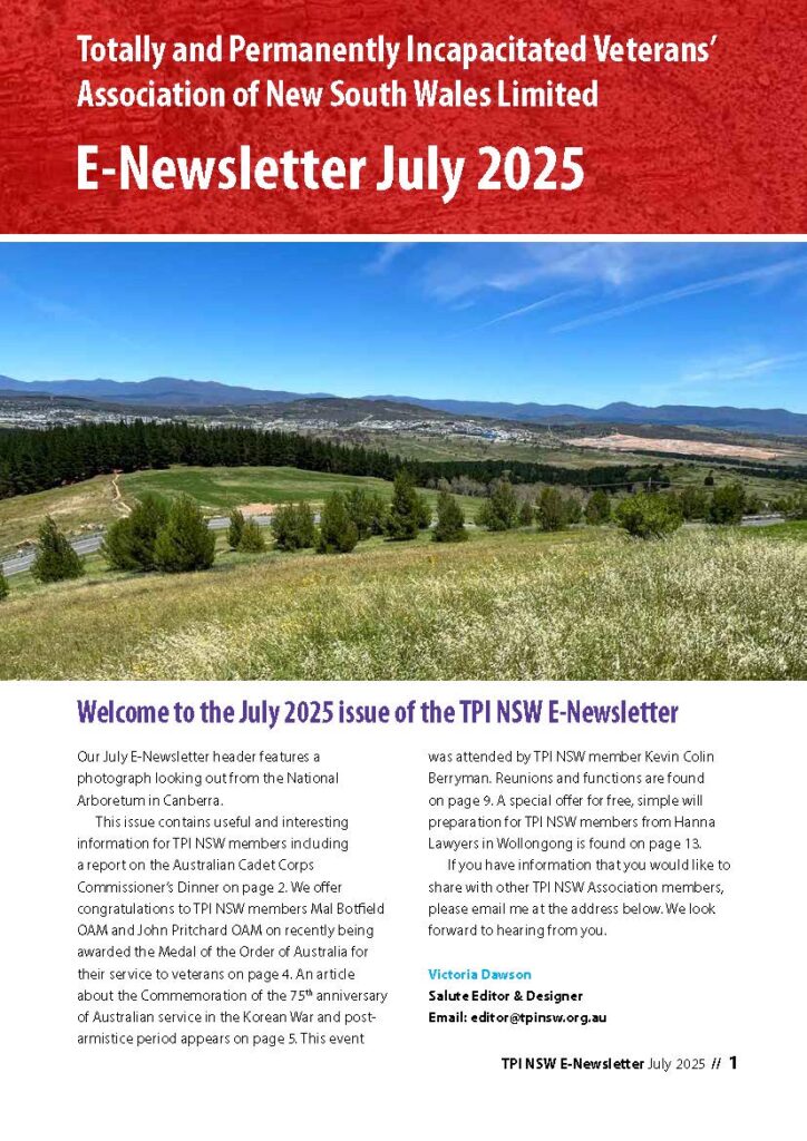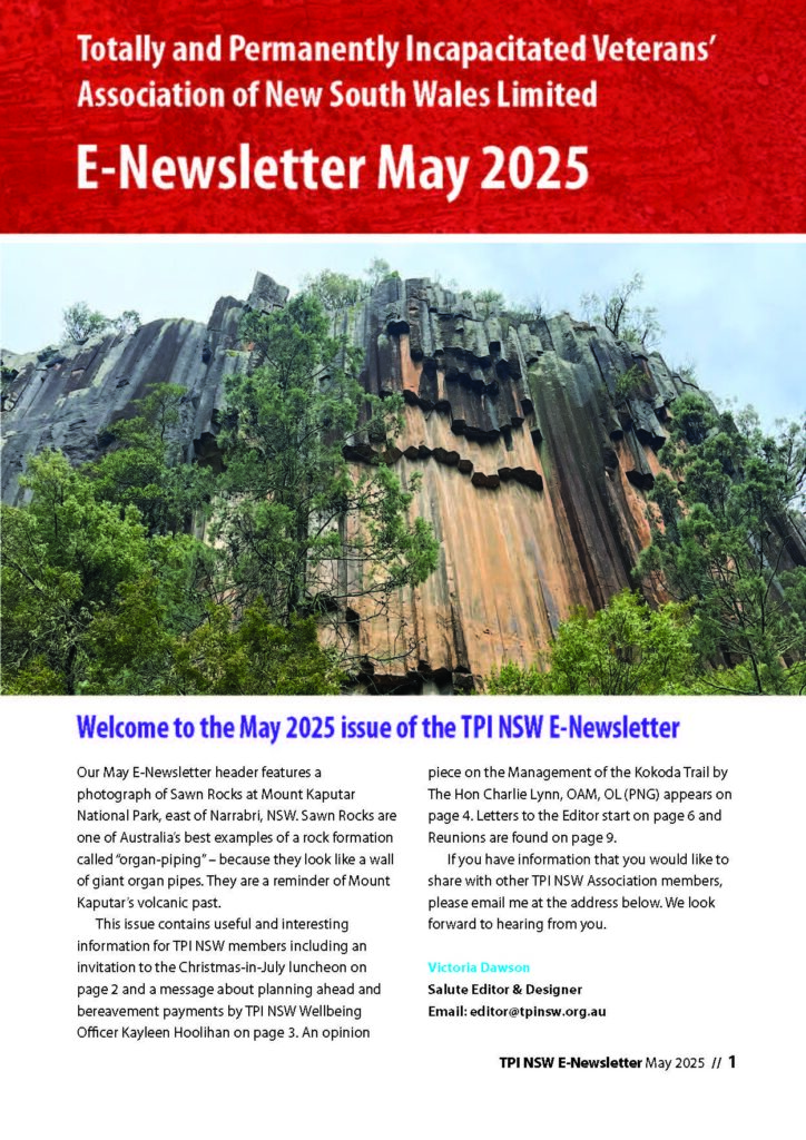 The E-Newsletters are emailed to TPI NSW members 7 times a year in February, April, May, July, August, October and November. If you would like to receive the E-Newsletter, please contact the TPI NSW Office on (02) 9235 1466 or office@tpinsw.org.au. Submissions for the E-Newsletters can be emailed to Salute Editor, Victoria Dawson at editor@tpinsw.org.au